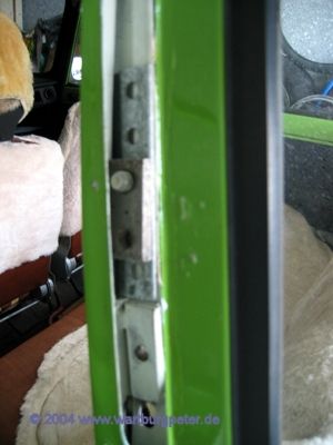 Rechte Seite ebenfalls geöffnet für den Umbau. Teile reinigen, Rostschutz auftragen... Blick von außen auf die Gurtbefestigung der rechten Seite. |